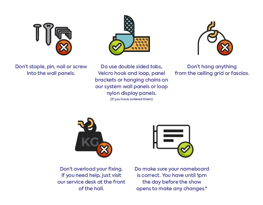 4. You cannot fix anything to the wall panels using nails, staples, or screws. Lightweight polyboard or card panels can be fixed with double-sided Velcro, twinstick pads or blu-tack. Any damage to the AMP Panels will be chargeable to the exhibiting company.